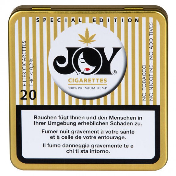 Die Joy Special Edition Hanfzigarette mit purem CBD ist eine sagenhaft wohlschmeckende Hanfzigarette. Die Zigaretten sehen aus wie ganz normale Zigaretten und besitzen einen normalen Baumwoll-Filter. Im Innern jeder Zigarette befindet sich reiner CBD-Hanf, der beim Anzünden süsslich duftenden Rauch ergibt. Da kein Tabak enthalten ist, wird auch kein Nikotin freigesetzt.